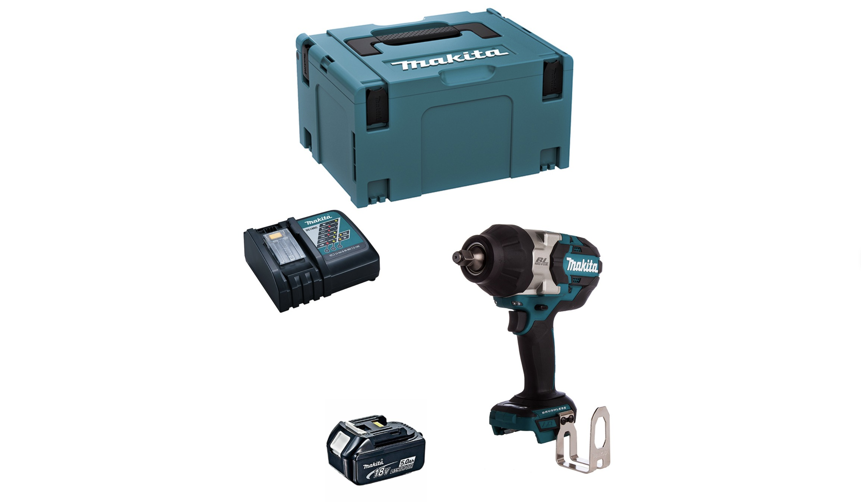 Clé à chocs 18 V puissante avec un couple de serrage de 1000 Nm. Vendue avec une batteries 5,0 Ah, chargeur et coffret MakPac.