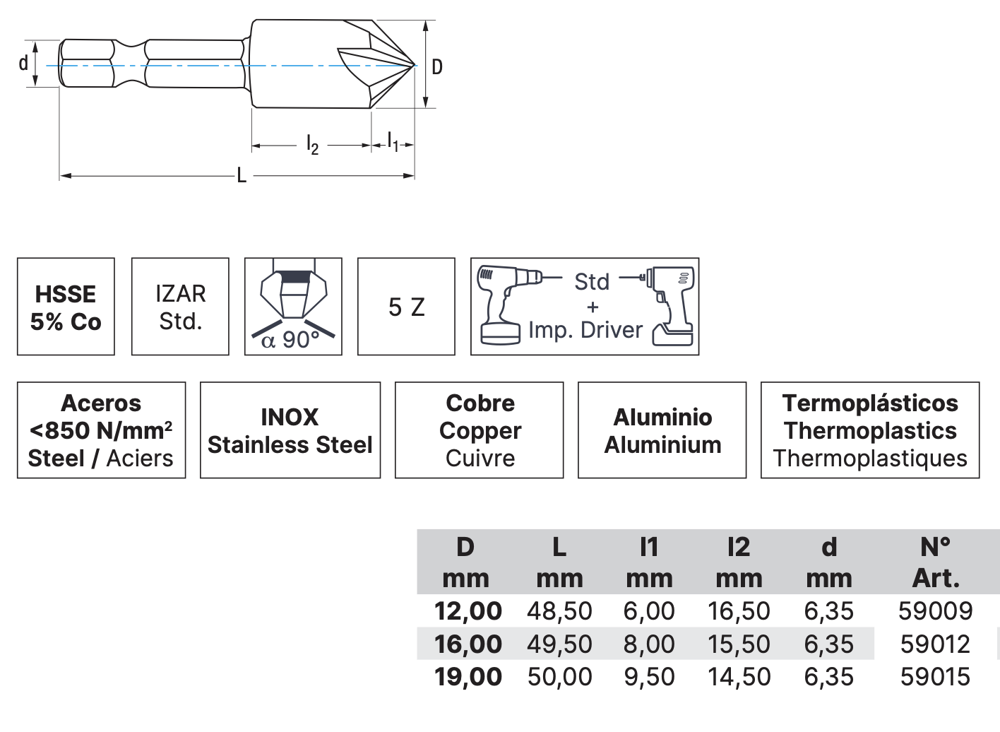 Fraise à noyer HSS 5Z DIN E6.3 – 12 mm – IZAR 59009
