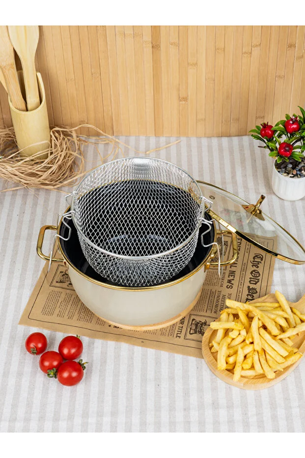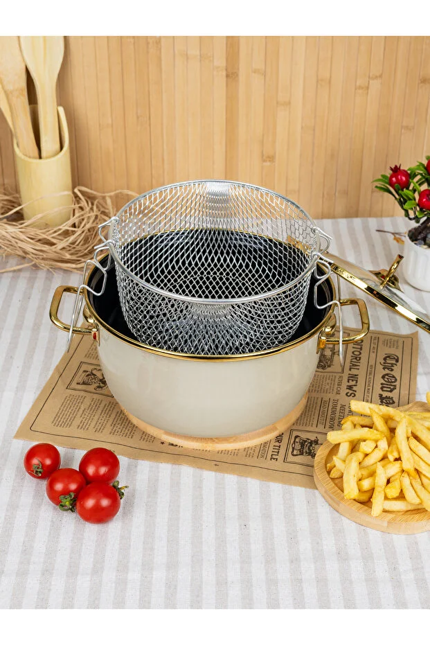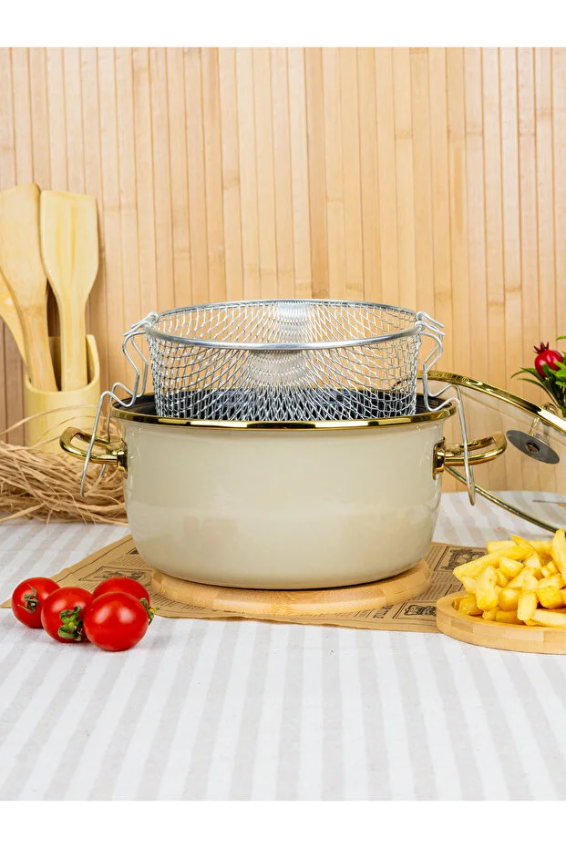 Friteuse Traditionnelle Beige en Acier Émaillé 22 cm / 3,7 L avec Panier en Acier et Couvercle – Compatible Induction – LPP GRANDEUR 08
