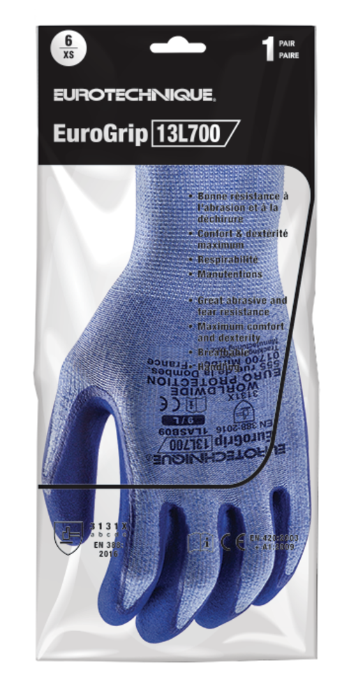 Ce gant de protection en manutention EUROGRIP 13L700 possède un double enduit en latex sur la paume avec finition grainée assurant une grande dextérité et un grip exceptionnel en milieu humide. Nous vous recommandons ce gant en milieu humide.