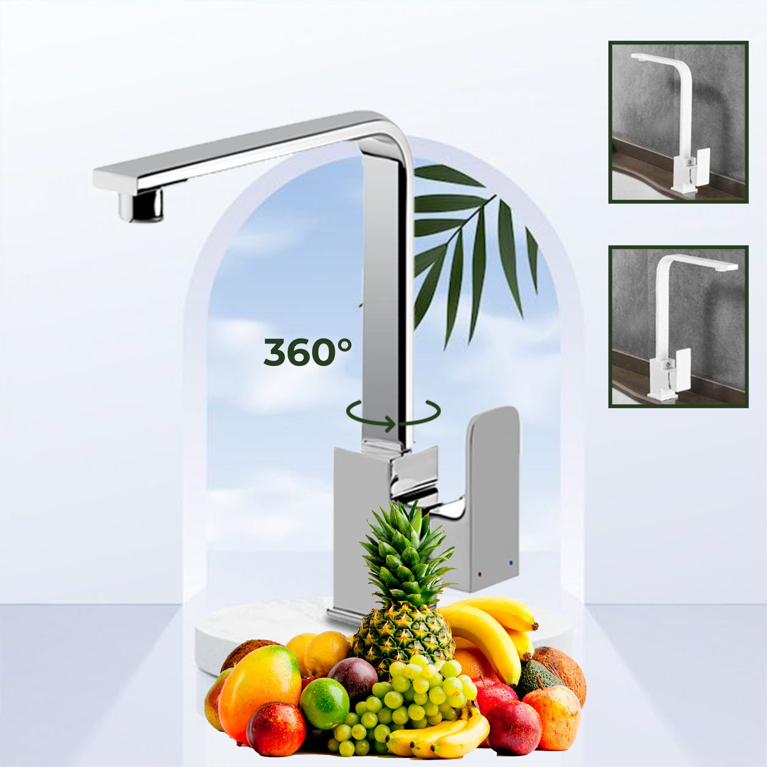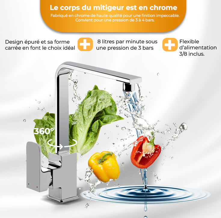 Son design épuré et sa forme carrée en font le choix idéal pour une cuisine moderne. Le bec haut, pivotant à 360 degrés, vous procure un confort optimal lors de vos tâches culinaires au quotidien.