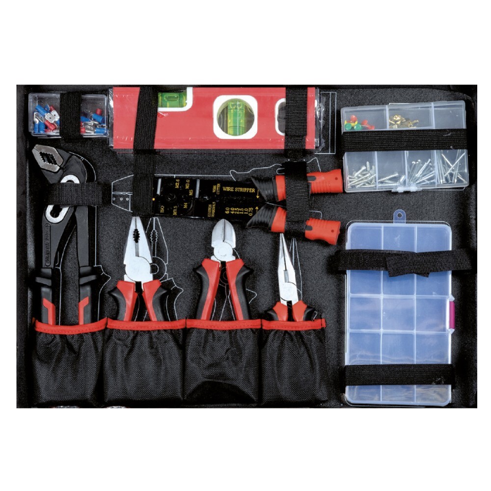en acier carbone, longueur 200 mm 1 pince universelle en acier carbone, longueur 175 mm, 1 pince multiprise en acier carbone chromé, longueur 250 mm 1 pince à bec long, longueur 150 mm, 1 pince coupante diagonale, longueur 150 mm, 1 boite en plastique multi-cases :