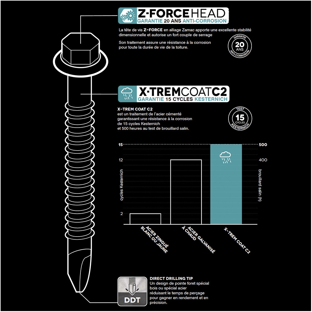 - Corps de vis : Acier cémenté TRAITÉ X-TREM COAT C2 Résistance à la corrosion : – 15 cycles Kesternich suivant tests Norme NF EN 3231- Essai au Brouillard salin = 500 heures.