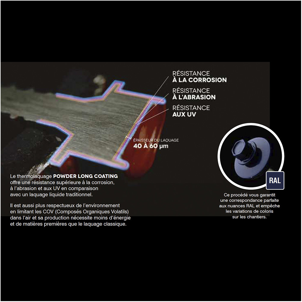 - Résistance à la corrosion : – 25 cycles Kesternich- Essai au brouillard salin = 1000 heures.